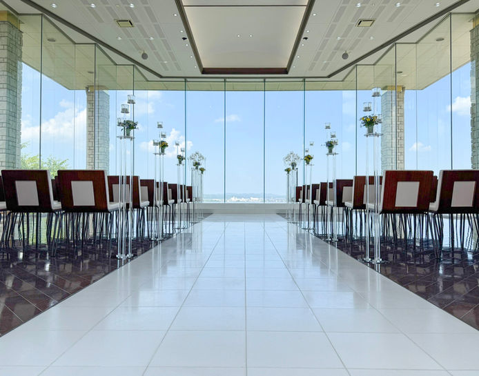 ガラス張りのチャペル内は、昼は澄みきった大空、夜は宝石のようにキラキラと光る星空と夜景でお二人の大切なセレモニーを華やかに演出してくれます。